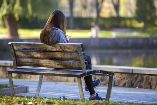 Back view of young girl with long hair sitting on wooden bench in summer park using cellphone on green trees and lake blurred sunny background.