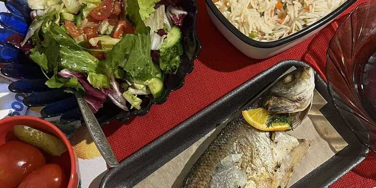На гаряче — курячі гомілки з травами, картопля запечена, а ще якийсь рататуй із баклажанів. Десерт — пляцки різні, кремовий торт.