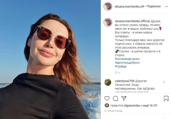 “Друзі, ви хотіли дізнатися правду, чому мене немає в ваших улюблених шоу? Всі відповіді – в моєму новому інтерв’ю. Тільки завдяки вам, мої дорогі передплатники, я знайшла сміливість про це розповісти вперше”, – написала Марченко.