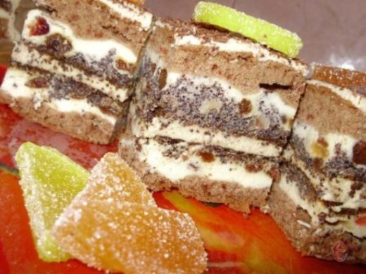 Маковий шар: мак запарити й тричі змолоти на м’ясорубці з горіхами (я збивала блендером разом із цукром). Додати родзинки, цукор і яйця. Усе подрібнити й ретельно вимішати.