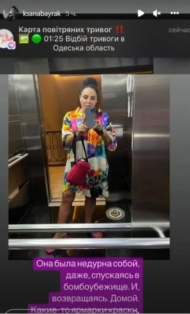 Байрак зняла себе в дзеркалі в ліфті. На ній була легка літня сукня з яскравими квітами та рожеві в’єтнамки.