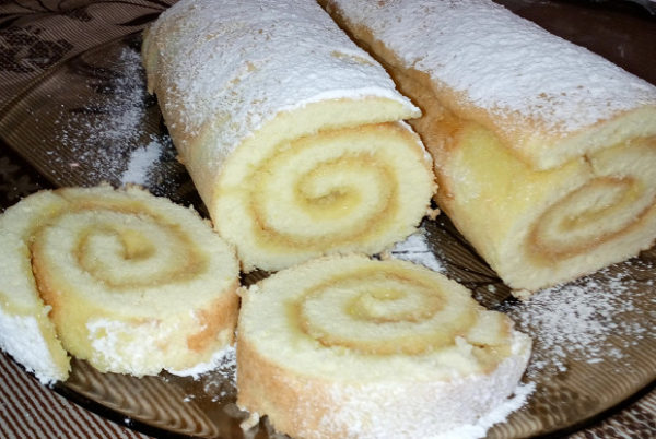 Гарячий бісквіт необхідно швидко змастити будь-солодкою начинкою і закрутити в рулет.