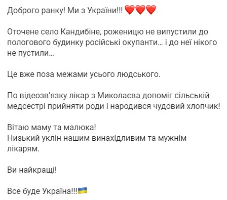 За її словами, село Кандибіне оточене окупантами російської Федерації. Вони не випустили породіллю з населеного пункту і нікого до неї не допустили.